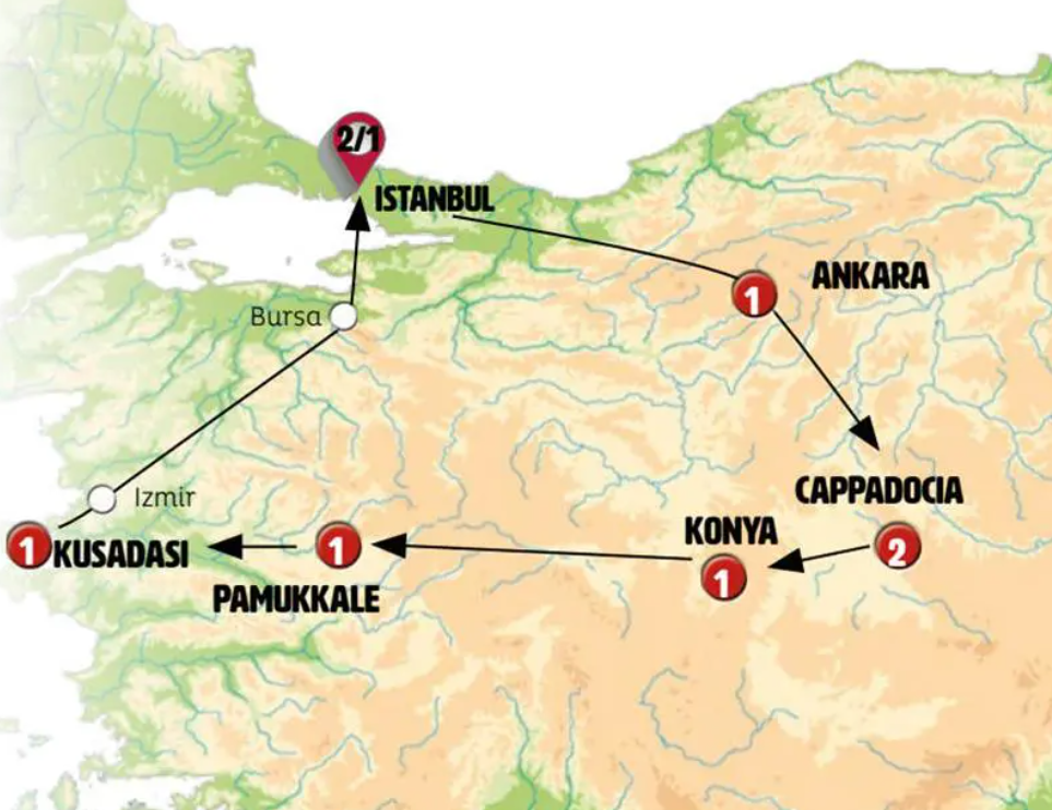 - 6 dinners included in: Ankara, Cappadocia, Cappadocia, Konya, Pamukkale, Kusadasi