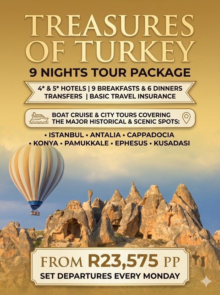 Your adventure begins in Istanbul, a city straddling Europe and Asia, where grand mosques, bustling bazaars and timeless waterways set the scene. Travel onward to Ankara, Turkey’s modern capital, offering insight into the nation’s contemporary identity and rich political history. From there, the journey continues to the surreal landscapes of Cappadocia, famous for its fairy chimneys, underground cities and unique rock formations. A visit to Konya, the spiritual heart of Turkey and home of the Whirling Dervishes, provides a deeper understanding of the country’s religious and cultural roots. Next, experience the natural marvel of Pamukkale, where cascading white travertine terraces and ancient thermal pools create one of Turkey’s most iconic sights. The tour concludes in Kusadasi, a charming coastal town on the Aegean Sea, perfectly positioned for exploring the ancient city of Ephesus and enjoying a relaxed seaside atmosphere. This journey offers a perfect balance of history, culture, spirituality and natural beauty, an immersive introduction to the many faces of Turkey.